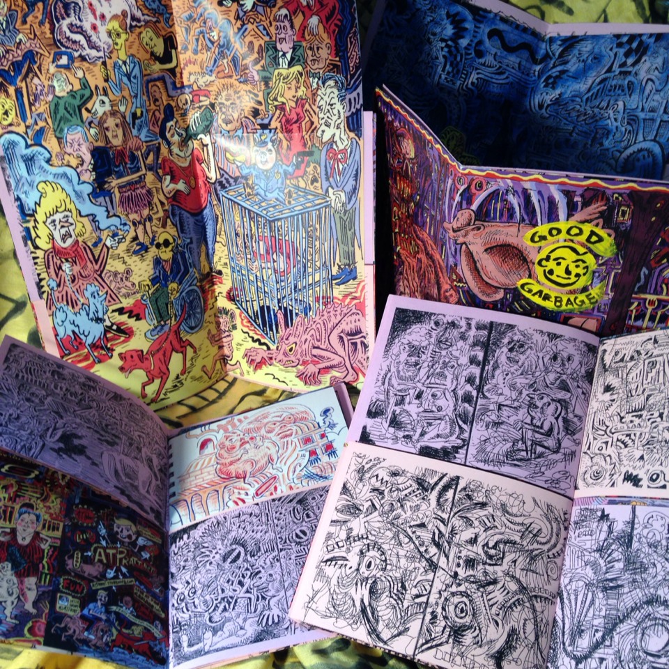 From the ashes of a misprinted run of "Sketches: Made to Last" comes "GOOD GARBAGE": a new illustration zine with all of the full colored sketches from that zine (albeit a bit scrambled up) repurposed as a hand-painted cover and endpapers, plus 16 more black and white drawings on pink and lighter pink paper, PLUS full color interior vertical foldout spread poster, double page middle spread and 2 more full color full page drawings. This is a big trickster full of surprises. Great bang for buck.