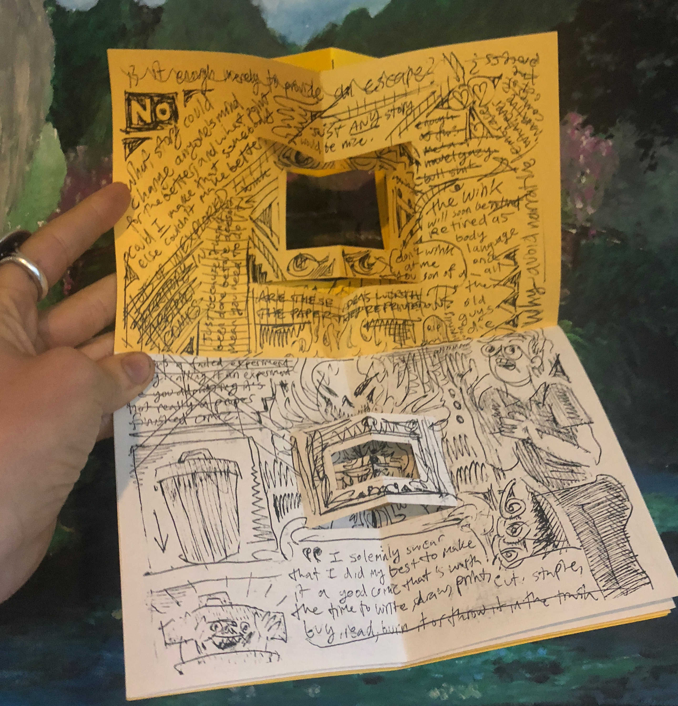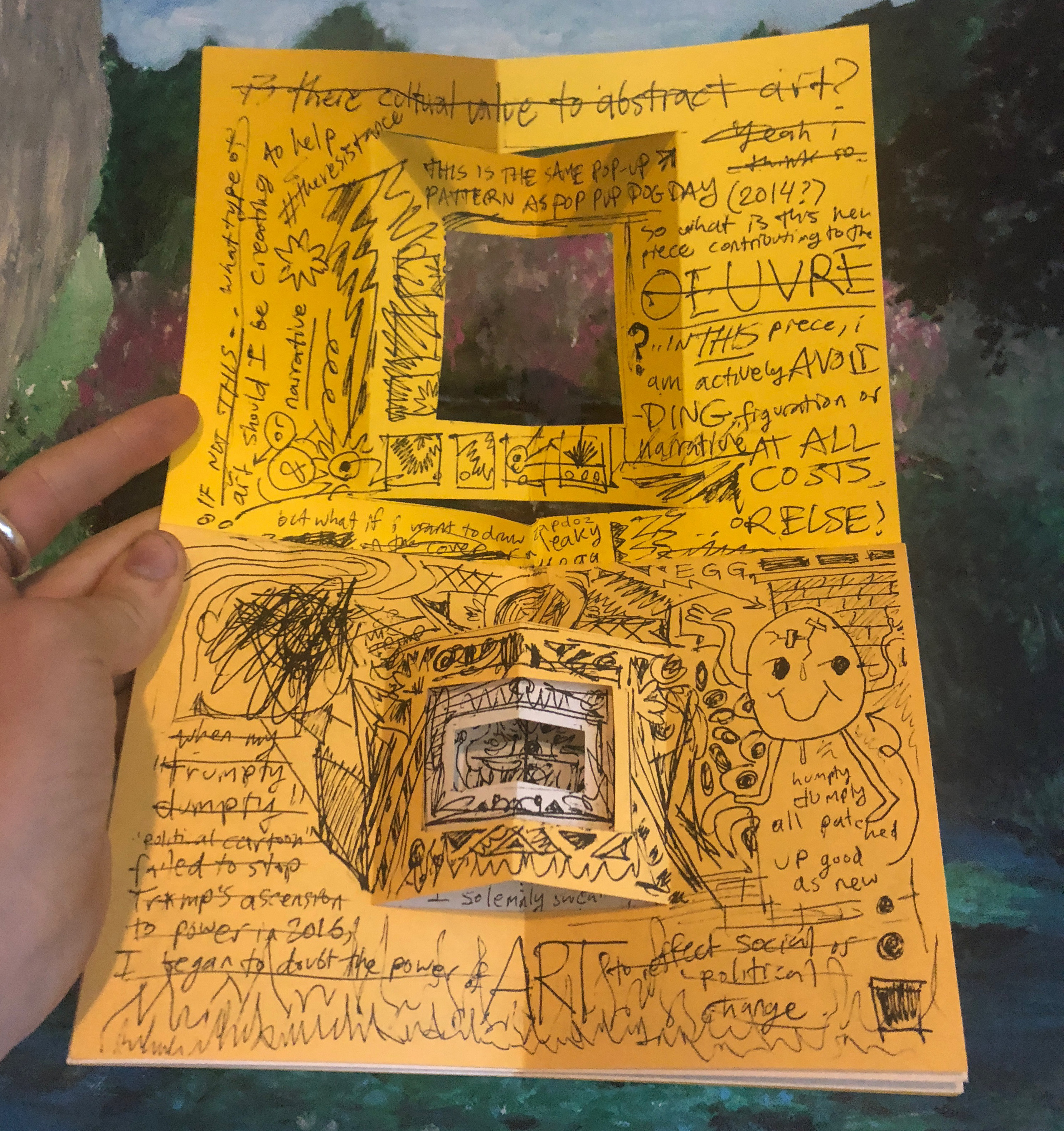 One man's "honest" attempt to heal the nation with an "abstract" pop-up "comic" sketchbook zine. Starts out as an abstract pop-up zine and unravels itself as it tracks my creative process and deals with big serious topics such as abstraction vs. representation and political art. Very cerebral (in so much that it takes place inside of my brain) and very stupid (let's face it they all are) at the same time.