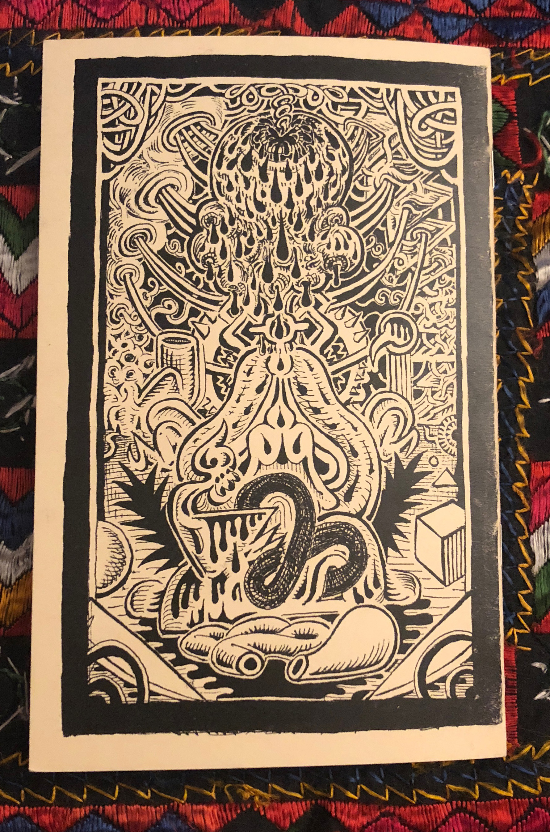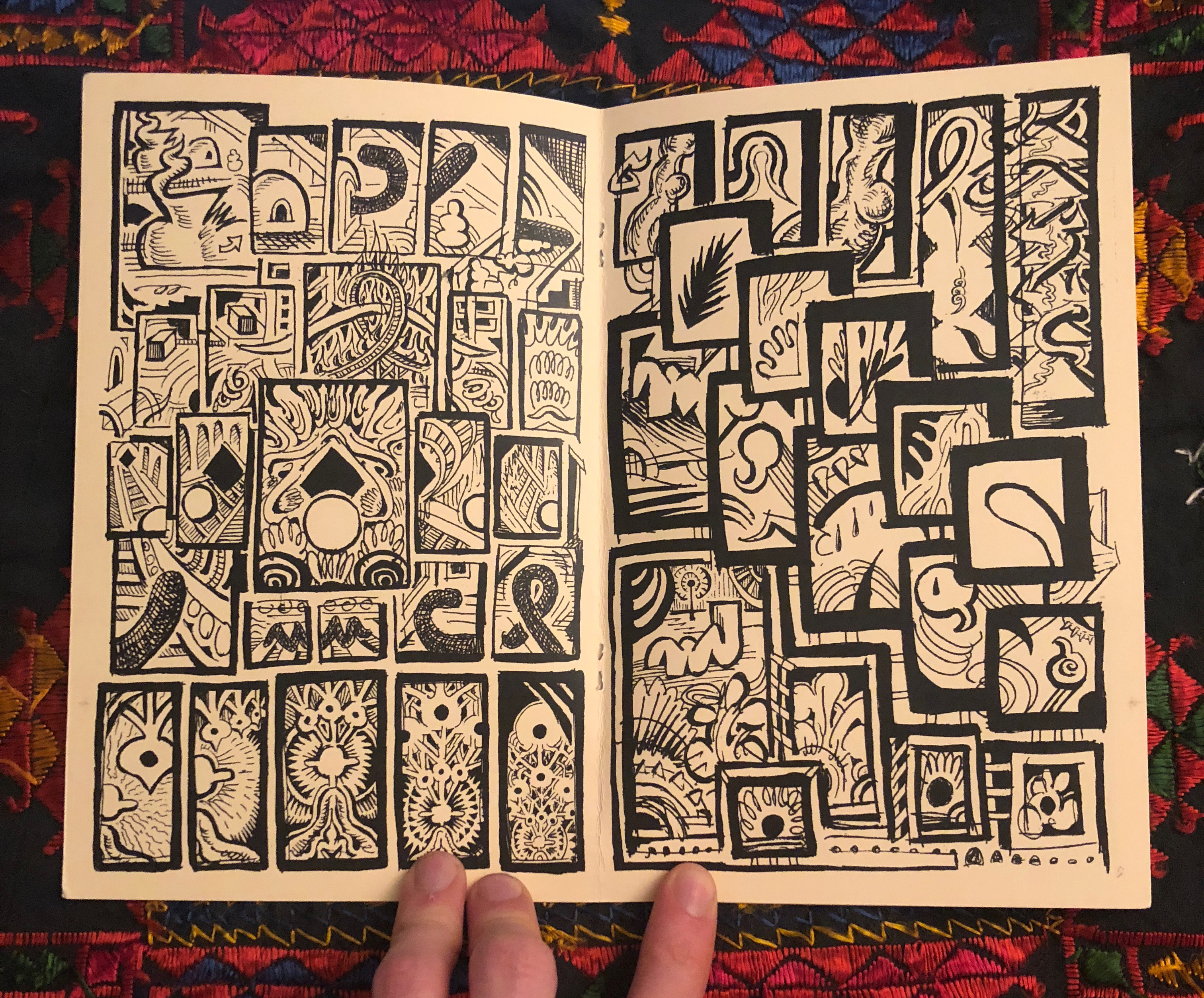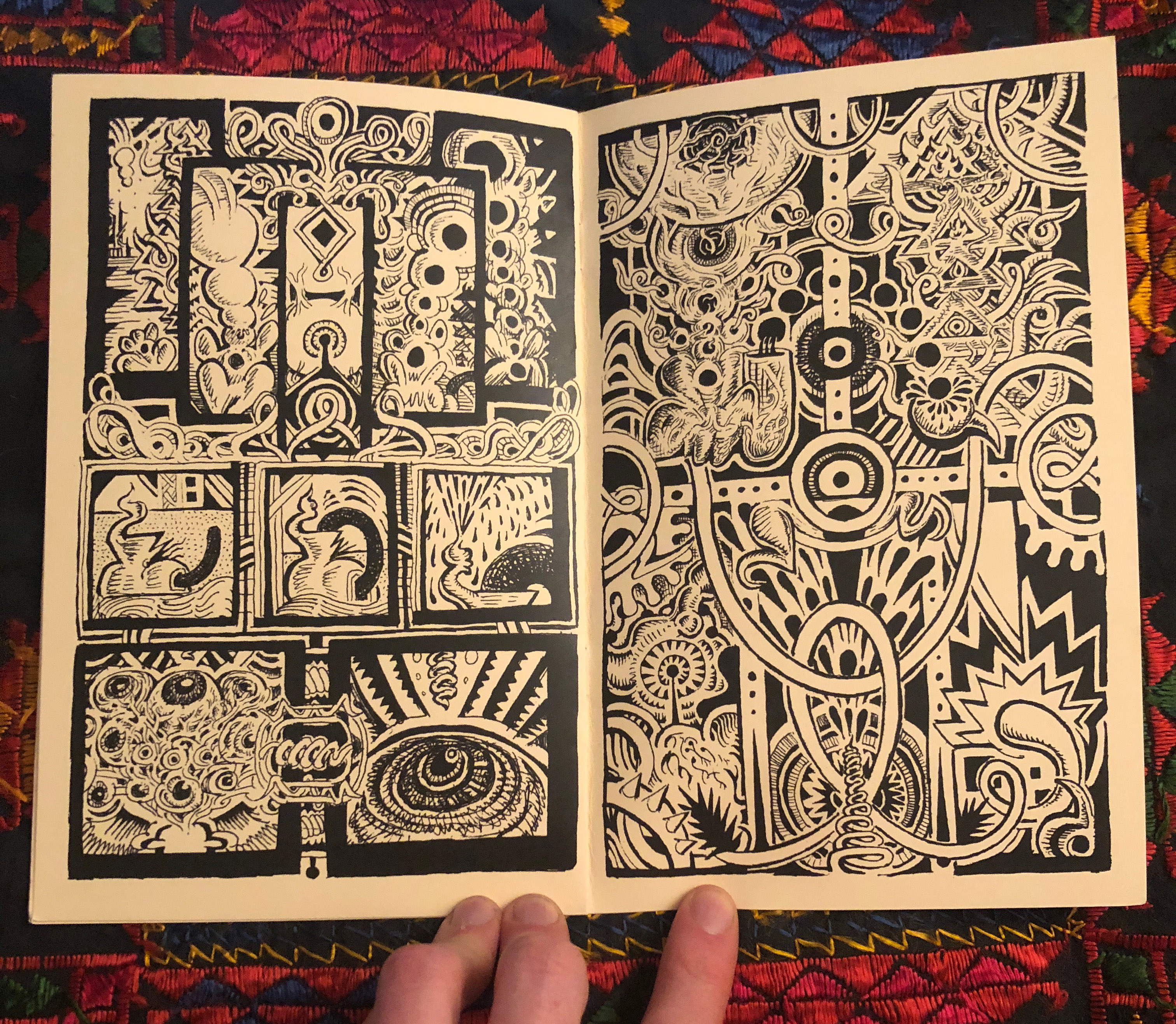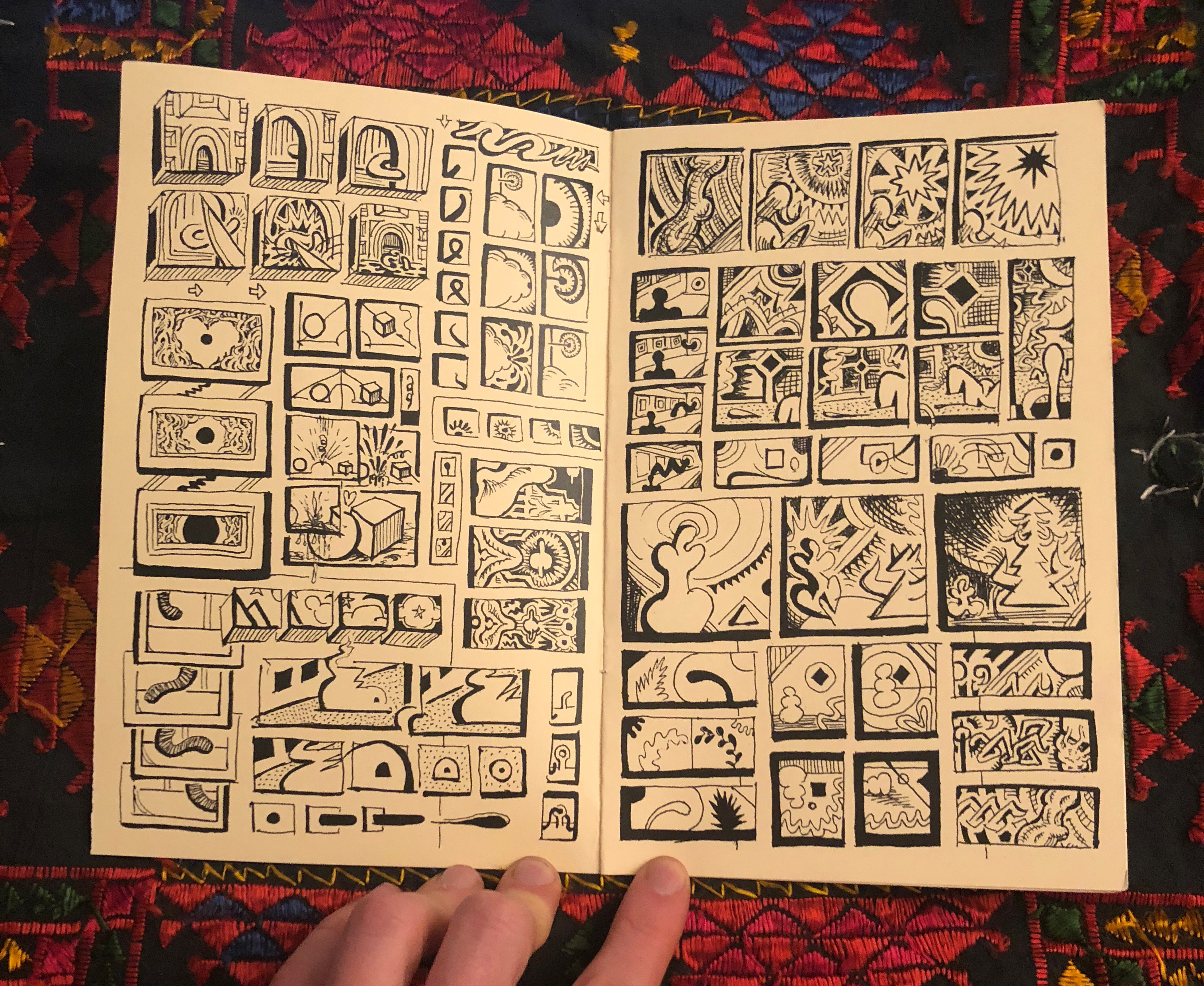 8 8.5" x 5.5" pages (including cover) abstract comic printed on cream colored cardstock. The narrative follows a variety of "characters" as they interact with each other in a variety of ways; coming together, moving apart, merging, mixing, morphing from one panel to the next. We go from many little comic strips with many little panels on page 1, and progressing through the story the panels get bigger and bolder moving towards the Earth-shattering climax.