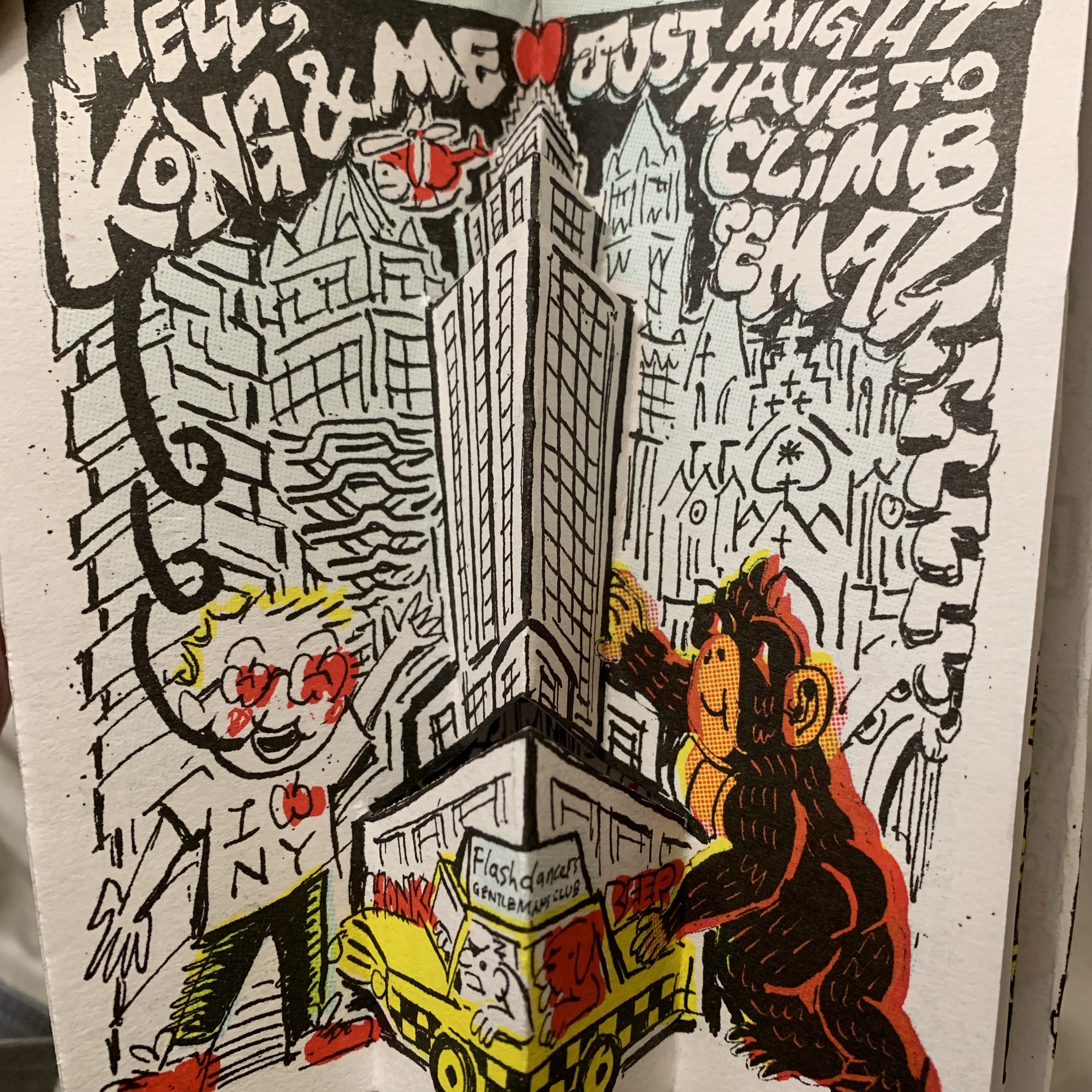 Big broadway musical comic book anthem to my city where i live born and raised, new york city, known to locals as big apple. 3 act structure with each act represented by connected popup foldout sequence. 4 color risograph print (black, bright red, mint, yellow) on 2 sheets of 11"x17" hand cut, folded and stapled (9 staples total) into this compact popup foldout comic, all contained within book jacket that has a q&a on the other side between the character Appleman Hattan and the author/director/lead actor/etc. A. T. Pratt.