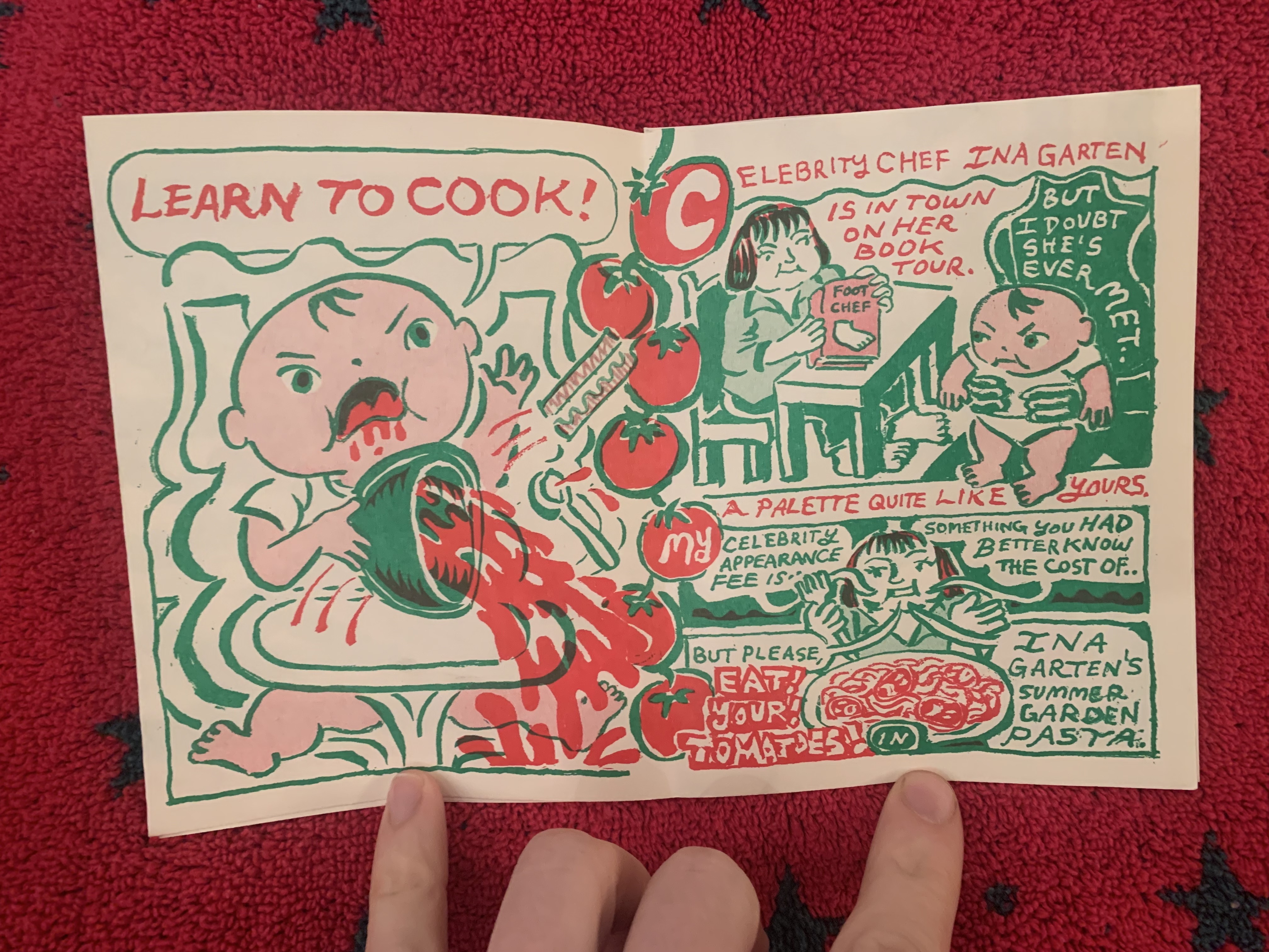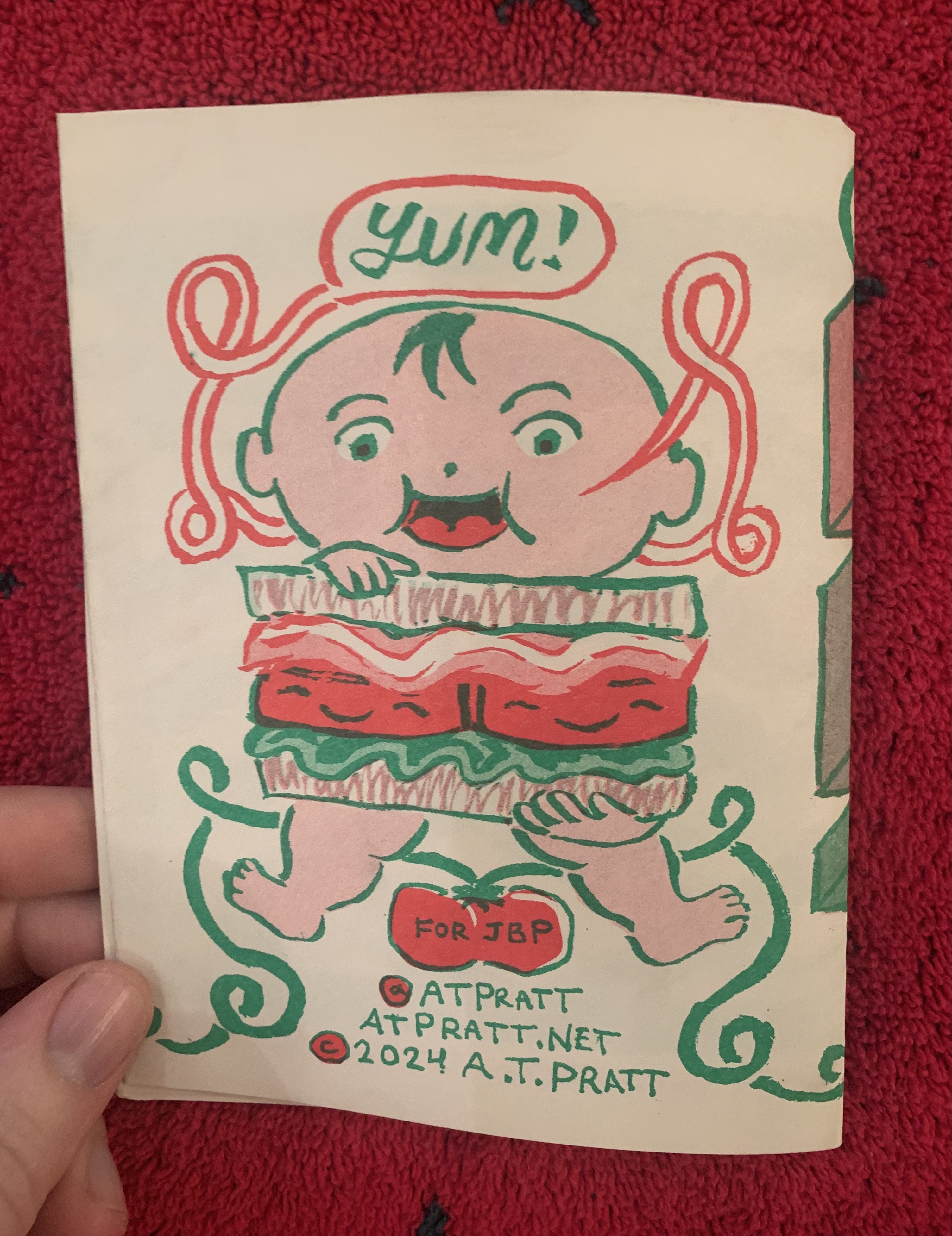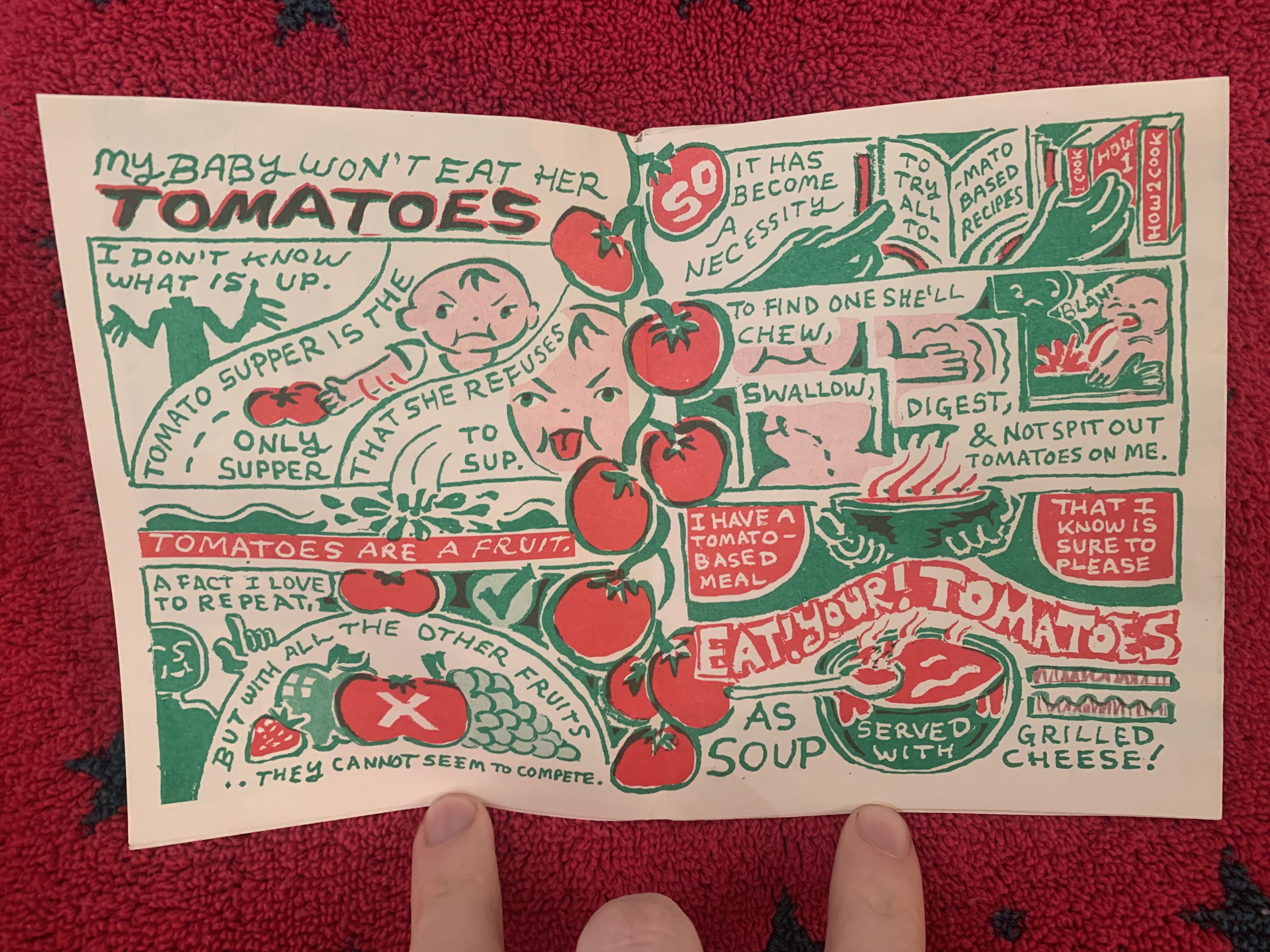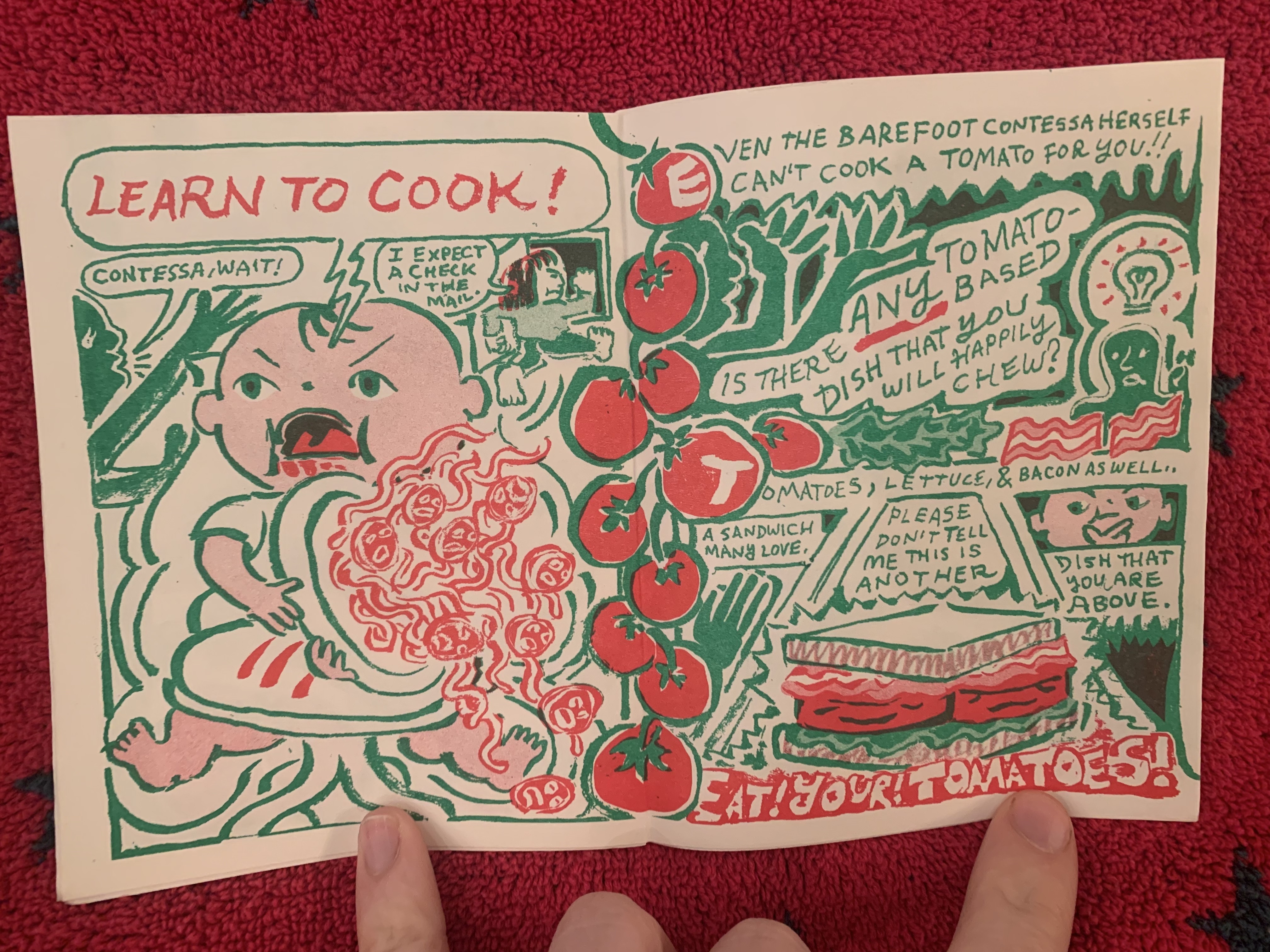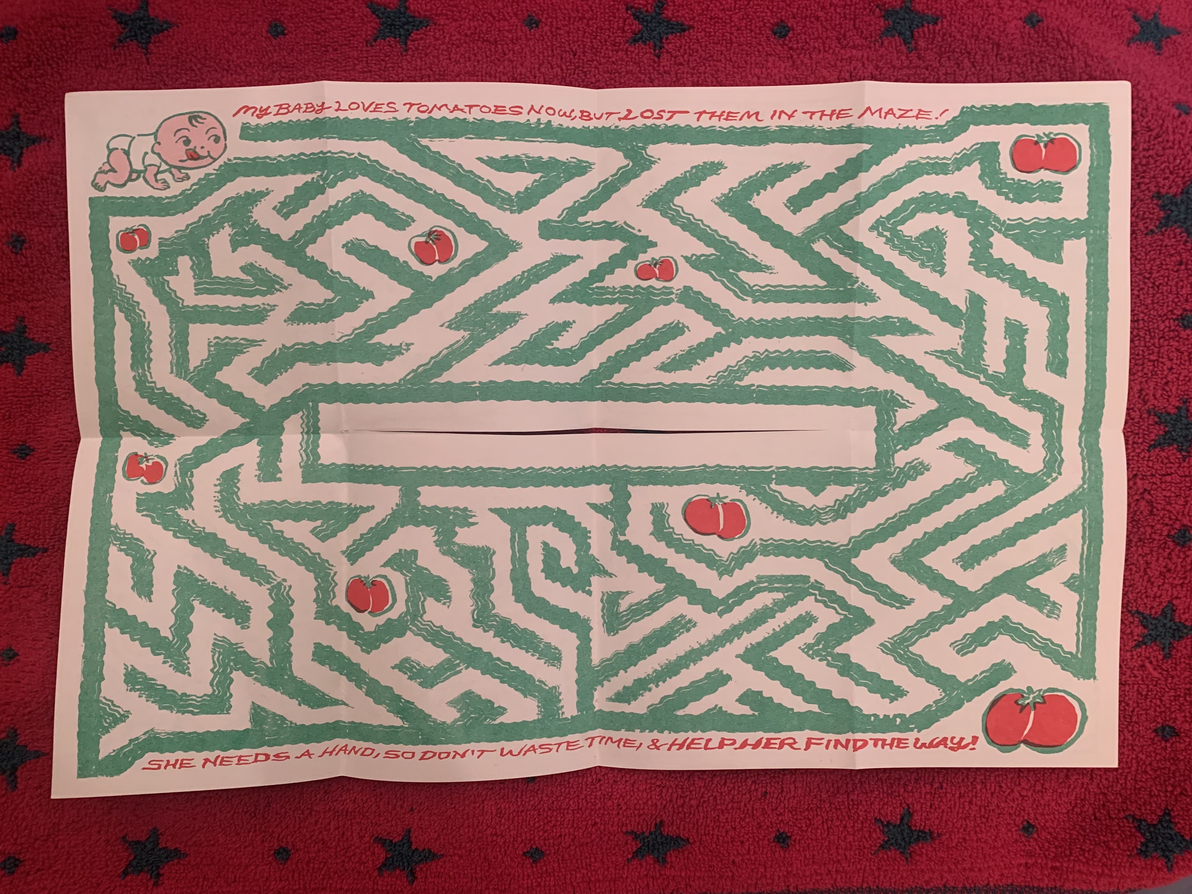 BLT Baby won't eat her tomatoes, refusing all tomato-based recipes, until she learns to love them after trying a certain sandwich. Then after learning to love them, you unfold the comic and she must find all 8 tomatoes in the maze.